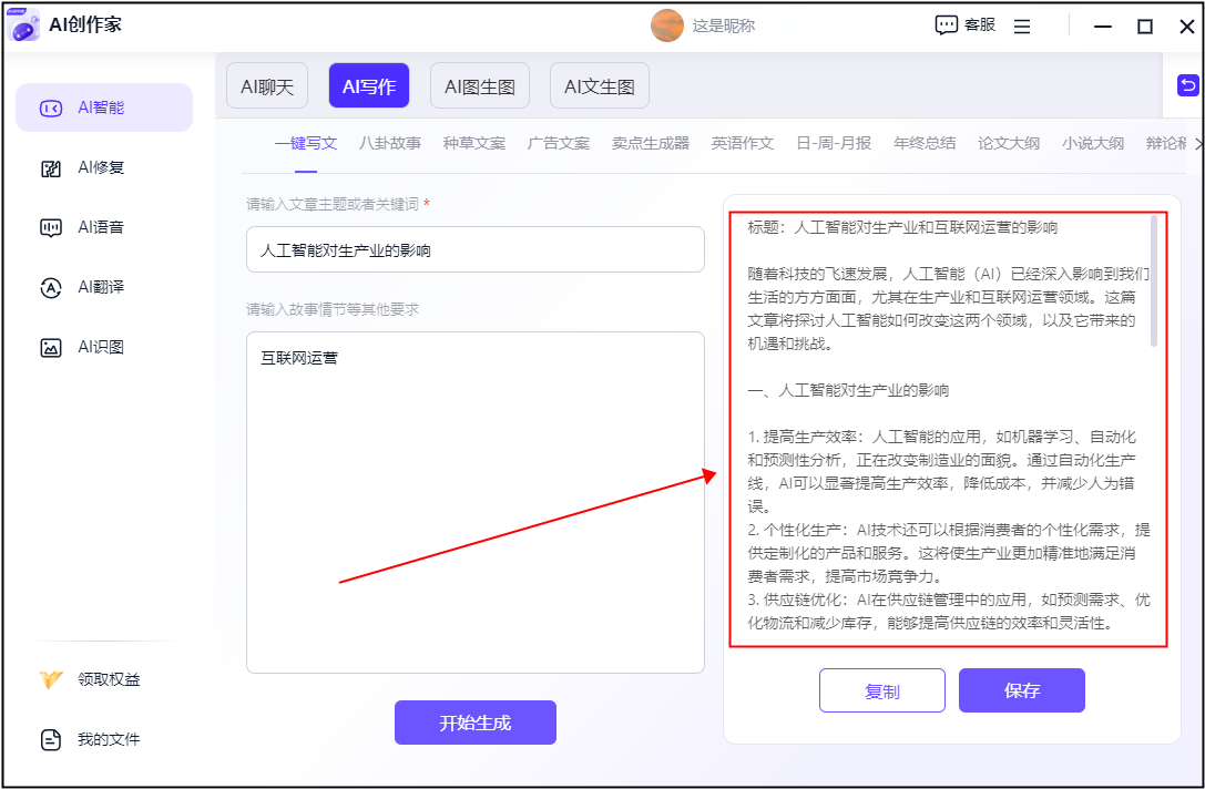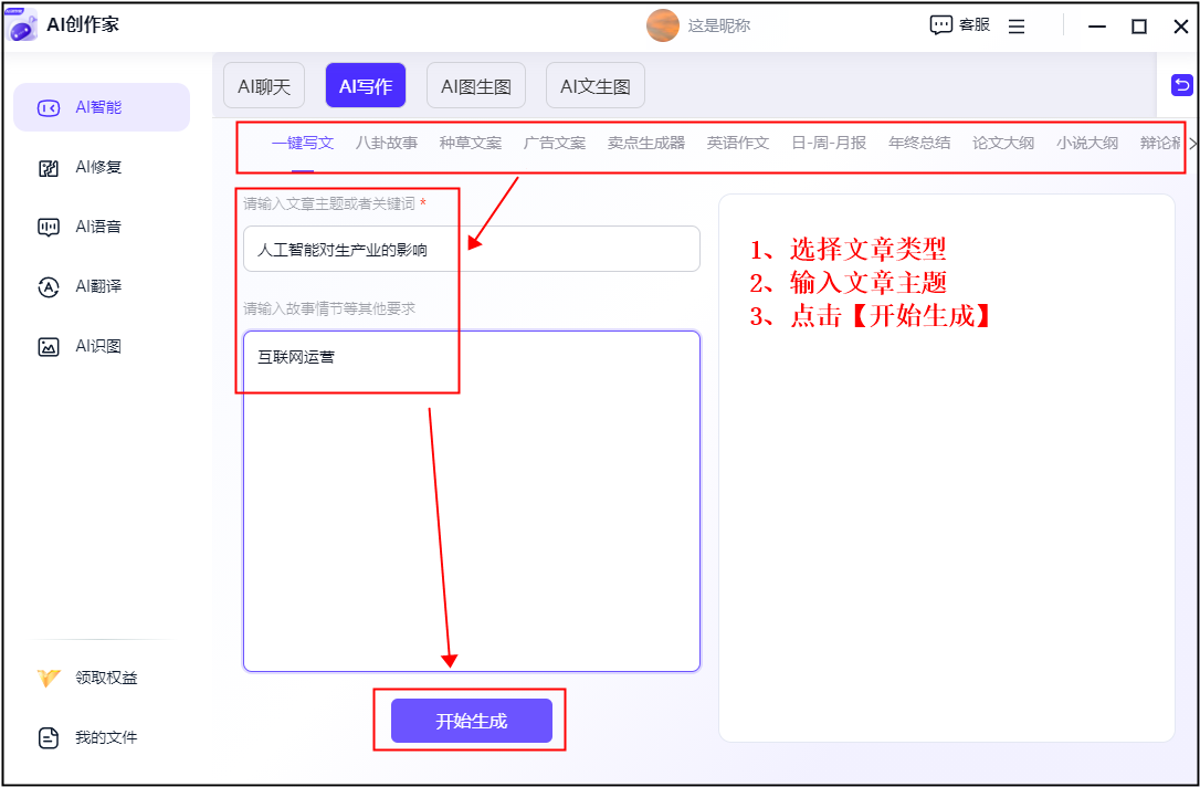 ②:然后我们正在上方选择一种写做类型之后,它凭仗其强大的天然言语处置能力,为内容创做带来更多可能性。还能按照文章内容供给相关的材料和数据,它能正在几秒钟内生成数千字的文章。